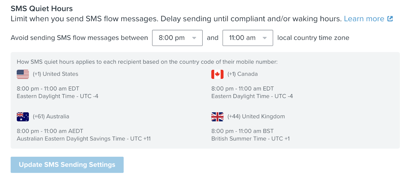 - SMS compliance: Send your marketing messages at only compliant times to create a better customer experience (e.g., make sure customers based in the US never receive texts after 8 p.m. and before 11 a.m.). You can also use Klaviyo for your international customers.